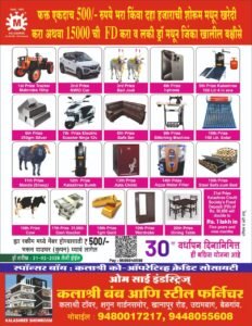 कला श्री ग्रुपतर्फे नागरिकांसाठी एक अत्यंत आकर्षक योजना जाहीर करण्यात आली आहे. या योजनेअंतर्गत फक्त एकदाच ₹500 भरून, किंवा कला श्री शोरूममधून ₹10,000 ची खरेदी करून, अथवा कला श्री को-ऑप क्रेडिट सोसायटीमध्ये ₹15,000 ची एफडी करून, नागरिकांना लकी ड्रॉ मधून 21 विविध बक्षिसे जिंकण्याची सुवर्णसंधी मिळणार आहे.