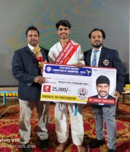 या राष्ट्रीय स्पर्धेत कृष्णा देवगाडी याने अत्यंत दमदार व उत्कृष्ट कामगिरी करत ‘ओपन चॅम्पियन ऑफ चॅम्पियन्स’ हा मानाचा किताब पटकावला. या उल्लेखनीय यशाबद्दल त्याला ₹25,000 रोख बक्षीस व स्मृतिचिन्ह प्रदान करून गौरविण्यात आले.